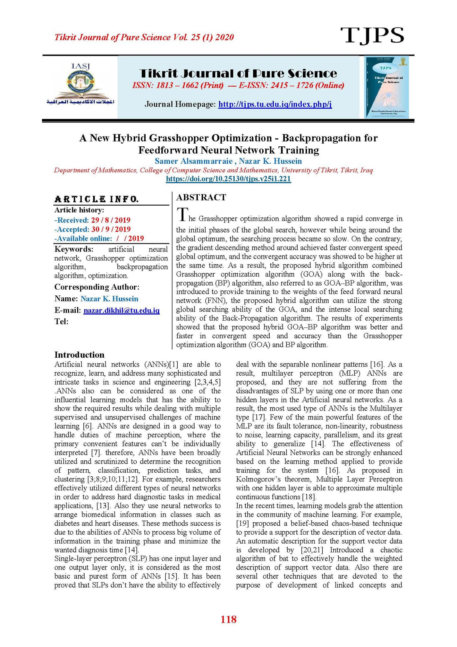 The Grasshopper optimization algorithm showed a rapid converge in the initial phases of the global search, however while being around the global optimum, the searching process became so slow. On the contrary, the gradient descending method around achieved faster convergent speed global optimum, and the convergent accuracy was showed to be higher at the same time. As a result, the proposed hybrid algorithm combined Grasshopper optimization algorithm (GOA) along with the back-propagation (BP) algorithm, also referred to as GOA–BP algorithm, was introduced to provide training to the weights of the feed forward neural network (FNN), the proposed hybrid algorithm can utilize the strong global searching ability of the GOA, and the intense local searching ability of the Back-Propagation algorithm. The results of experiments showed that the proposed hybrid GOA–BP algorithm was better and faster in convergent speed and accuracy than the Grasshopper optimization algorithm (GOA) and BP algorithm.
